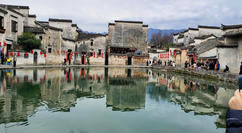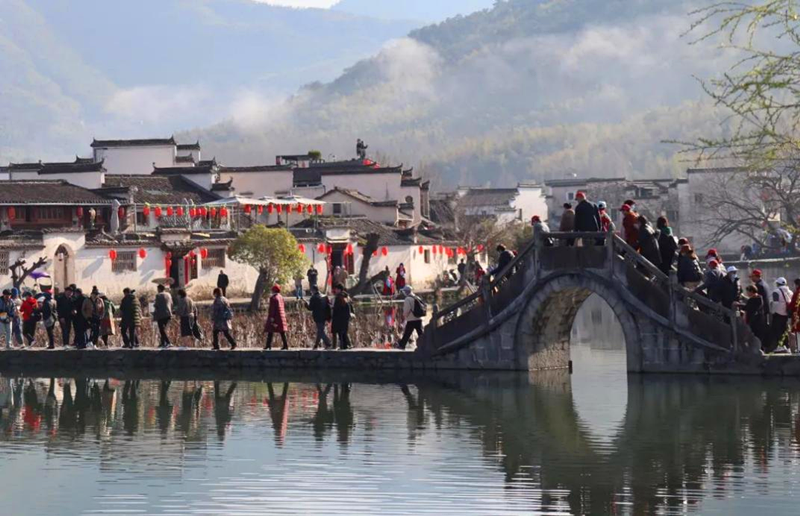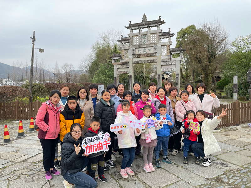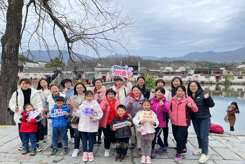 “無(wú)邊細(xì)雨濕春泥,隔霧時(shí)聞小鳥啼。楊柳含顰桃?guī)?,一邊吟過(guò)畫橋西?!焙甏宓镊攘κ悄切O具代表性的徽派建筑,古木窗欞,湖水清蓮,拱橋如虹,華惠女工們徜徉在這綿延的青磚古巷中,感受著徽州文化的博大精深。