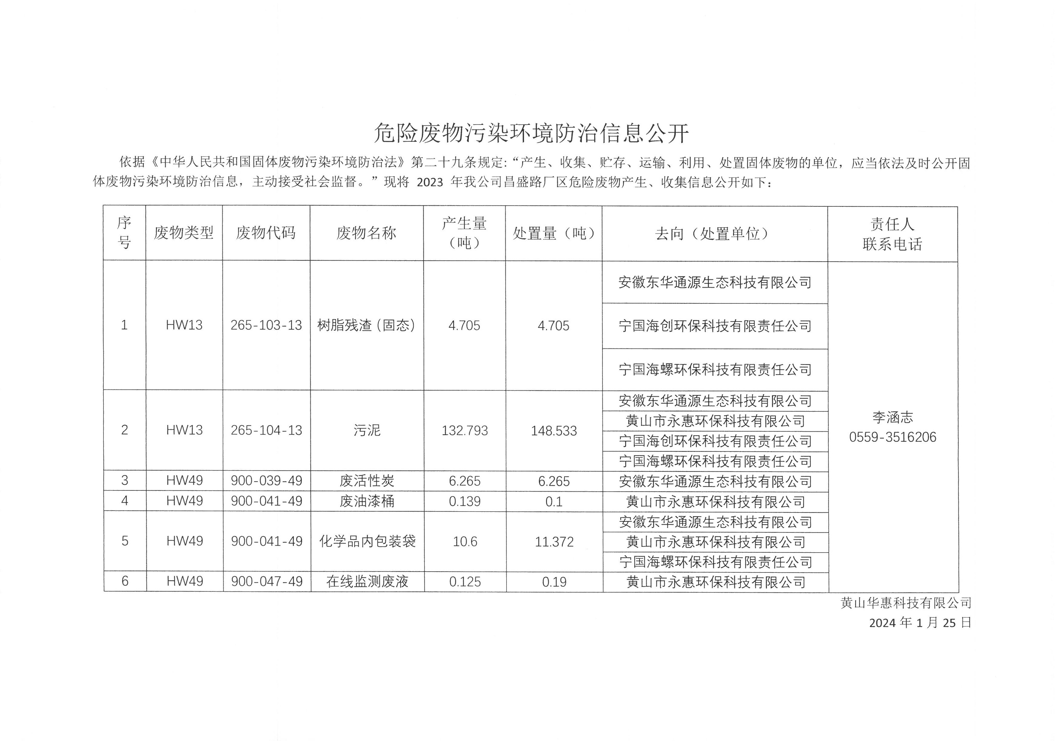 黃山華惠科技有限公司危險廢物污染防治信息公示-信息公開-黃山華惠科技有限公司