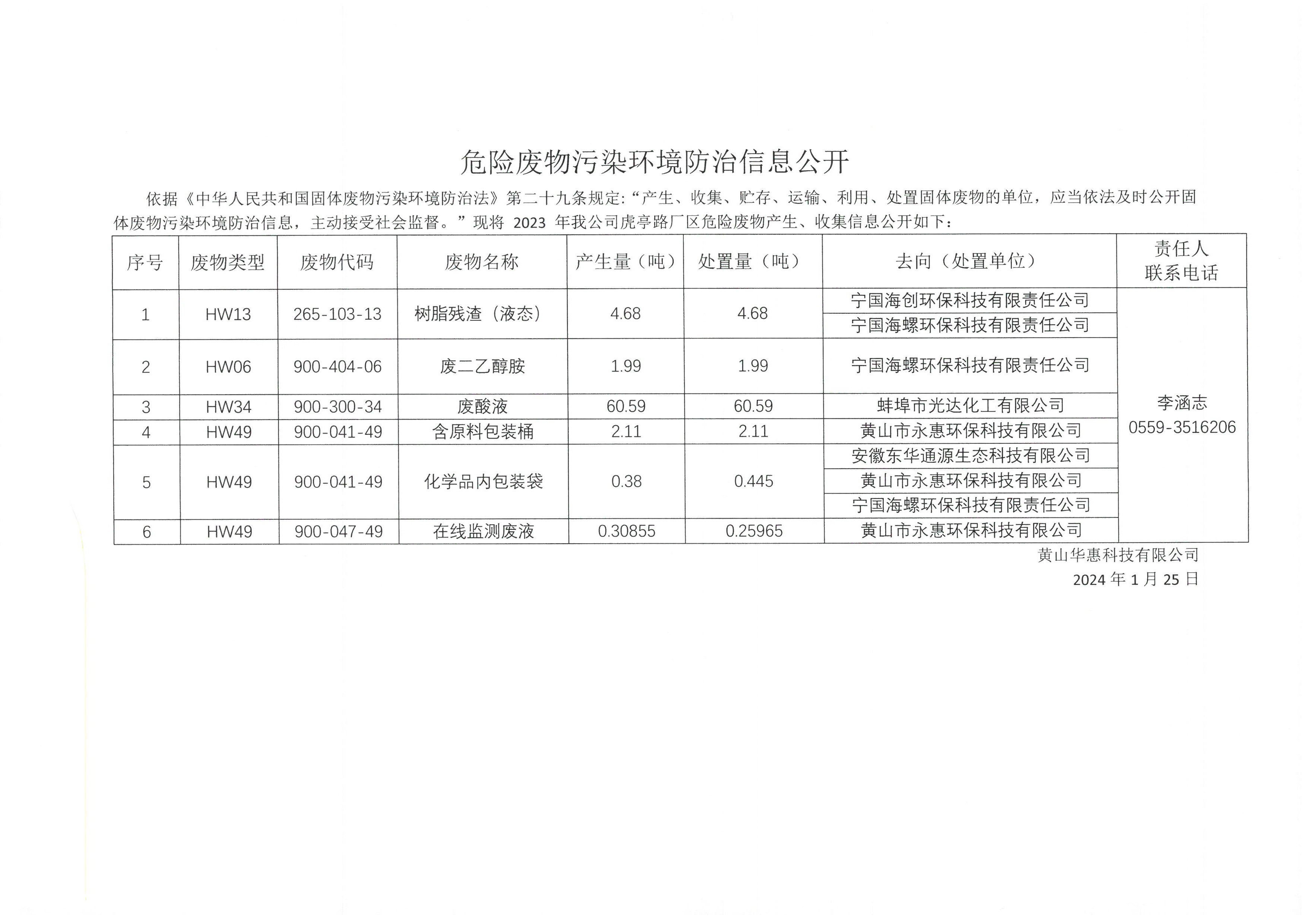 黃山華惠科技有限公司危險廢物污染防治信息公示-信息公開-黃山華惠科技有限公司