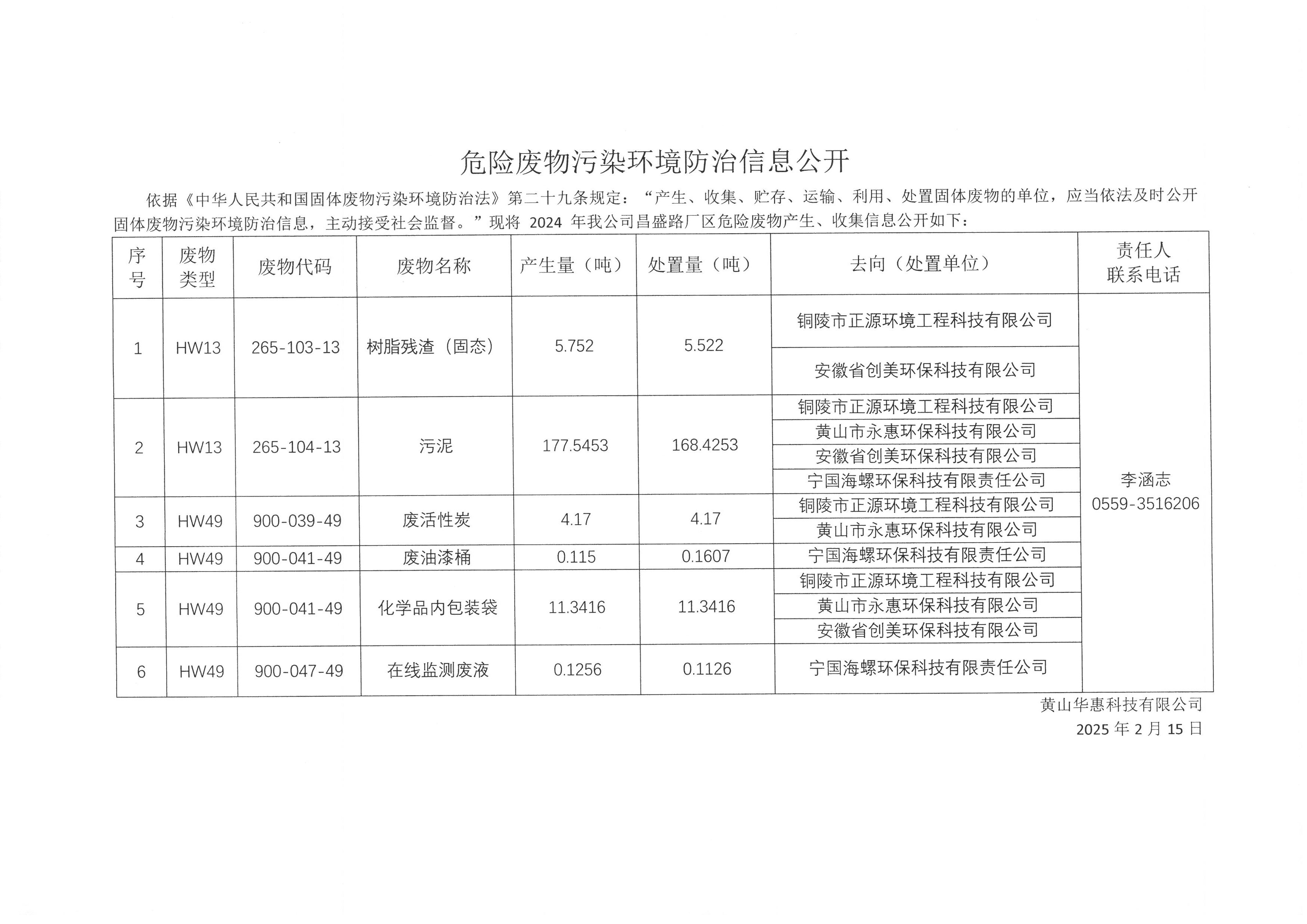 黃山華惠科技有限公司危險廢物污染防治信息公示-信息公開-黃山華惠科技有限公司