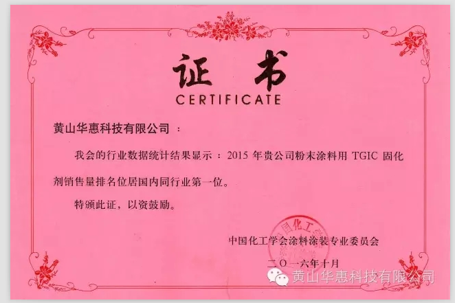根據(jù)中國(guó)化工學(xué)會(huì)涂料涂裝專業(yè)委員會(huì)進(jìn)行的2015年度行業(yè)統(tǒng)計(jì),華惠公司粉末涂料用TGIC固化劑銷售量排名位居國(guó)內(nèi)同行業(yè)第一位。
